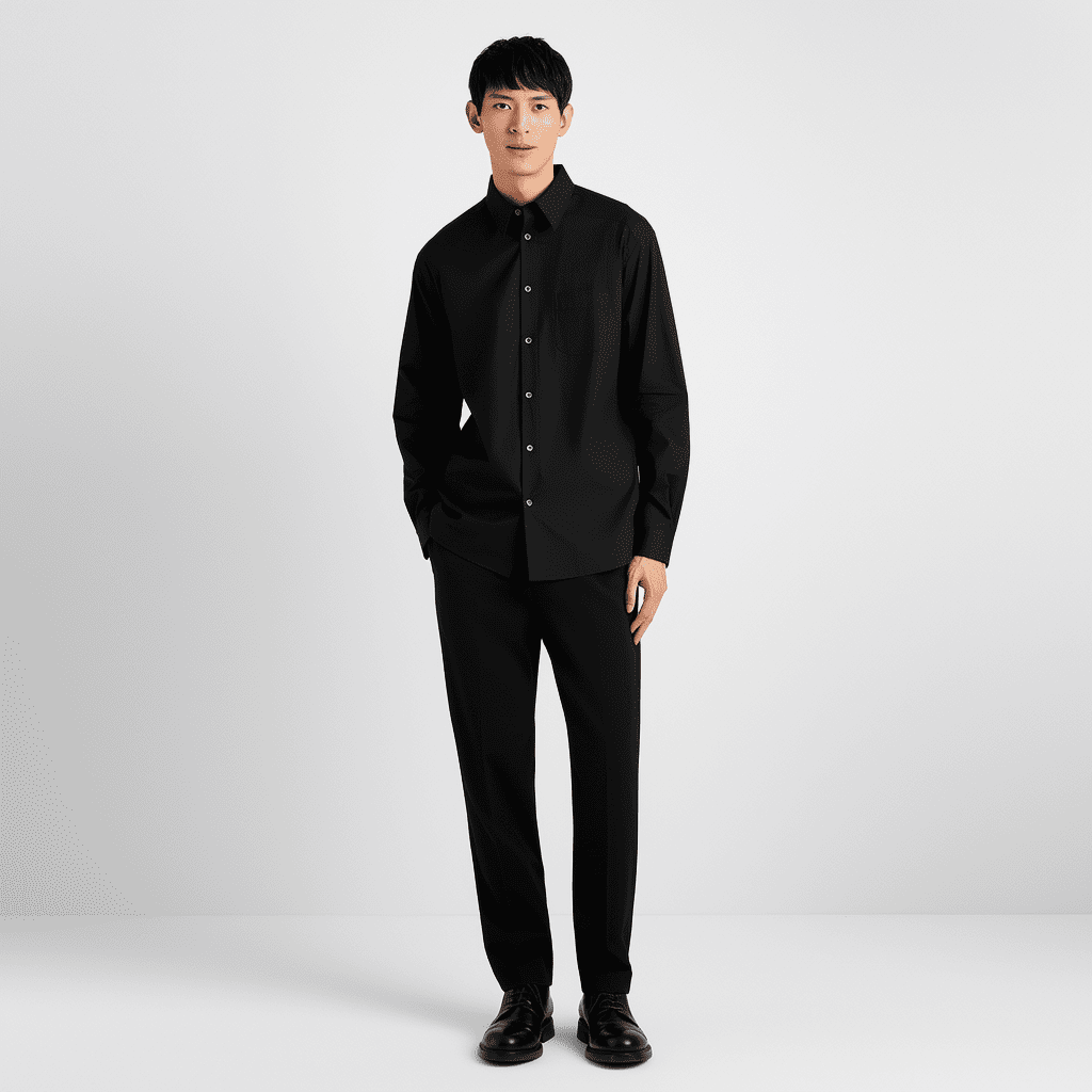一位简约风格的男性,黑色长袖衬衫搭配黑色休闲裤与皮鞋。他站在纯白背景前,姿态自然放松。画面采用柔和光线塑造,以黑白色调为主,展现单色搭配的高级感。高清极简摄影风格,16:9画幅,全身构图,突出简约服饰细节与现代质感。