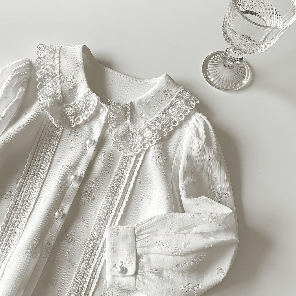 件精致的白色蕾丝衬衫,平铺于纯白背景之上。衬衫领口为复杂蕾丝花边,袖口呈荷叶边收口,胸前点缀几颗珍珠纽扣。面料轻薄透气,细腻蕾丝花纹清晰可见。柔和光线照射下,纹理与质感栩栩如生。旁置一只晶莹剔透的水晶高脚杯作为点缀。高清静物摄影风格,16:9画幅,特写构图,展现细节之美。