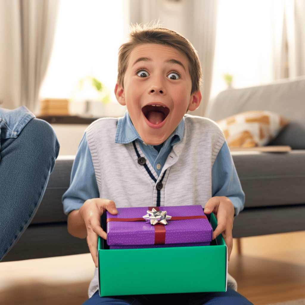一个孩子收到礼物时的惊喜瞬间。\"孩子眼睛睁得大大的,嘴巴微张,脸上洋溢着幸福的笑容\",他紧紧抱着礼物。男孩约七八岁,穿着休闲衣裤,皮肤白皙,头发蓬松。背景是温馨的家中客厅,有沙发和装饰画。近景特写,自然光线下展现细腻情感。